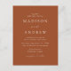 Cartaz de convite para casamento minimalista e moderno com detalhes de seu casamento em letras brancas com sotaques de escrita de caligrafia. O fundo de terracota pode ser alterado para uma cor de sua escolha. Personalize a parte traseira do cartão postal do convite de casamento chic com seu endereço de devolução, data de resposta desejada, site de casamento e instruções para os convidados usando as modelos de texto fornecidas. Projetado para coordenar com a nossa coleção de casamento do Modern Elegance.