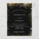 Um convite de casamento moderno e elegante. Fundo preto decorado com brilhos dourados falsos. Personalize e adicione seus nomes e detalhes do casamento. Letras brancas coloridas.