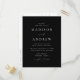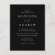 Convite de casamento minimalista e moderno em cartão postal com detalhes do casamento em letras brancas e acentos de caligrafia. O fundo preto pode ser alterado para a cor de sua escolha. Personalize o verso do cartão postal de convite de casamento chique com seu endereço de retorno, site do casamento, imagens, etc. Projetado para combinar com nossa coleção de casamento Modern Elegance.