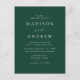 Cartaz de convite para casamento minimalista e moderno com detalhes de seu casamento em letras brancas com sotaques de escrita de caligrafia. O fundo verde da floresta pode ser alterado para uma cor de sua escolha. Personalize a parte de trás do cartão postal do convite de casamento com seu endereço de volta, site do casamento, imagens, etc. Projetado para coordenar com a nossa coleção de casamento do Modern Elegance.