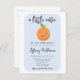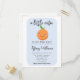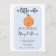 Cartaz de convite para chás de fraldas, de tema bonito e bonito, com ilustração pintada à mão de uma fruta laranja com um sorriso doce e bochechas cor-de-rosa. Este cartão azul é excelente para o chá de um menino.