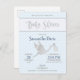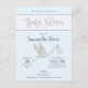 Elegante e fofo chá de bebê. Apresentando um script de caligrafia de cor prateada e um carregando de cegonha de cor prateada com bolinhas brancas e um claro fundo azul. Personalize alterando o texto com seus próprios detalhes ou clique em personalizar para adicionar seu próprio toque.