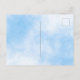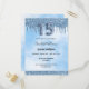 Um convite moderno, na moda e glamouroso para a Quinceañera, festa de aniversário 15. Um céu branco e azul como fundo com brilho azul, pingado de tinta pingando. O nome é escrito com um moderno script de estilo escrito à mão preto. Personalize e adicione os detalhes da sua festa. O número 15 é escrito com uma fonte de estilo balão, script. Verso: céu branco azul como fundo, design postal. Dica: Se você não quiser que pareça um cartão postal, clique em personalizar, vá para o verso e remova o divisor e o carimbo de posto.