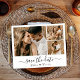Colagem de Fotos do Script 5 de Caligrafia Minimalista Moderno Elegante de Orçamento Salva as PostCards de Data em preto e branco. Esta delicada design romântica perfeita para o casamento moderno. Possui 5 (cinco) colagem de fotos em grade, uma caligrafia química com letra de coroa do estilo swash à mão. A foto do cheio traseiro com uma camada translúcida, você pode adicionar seus detalhes e informações de casamento. É fácil personalizá-lo com seus detalhes e fotos do casamento.