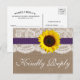 A coleção de girassol rústico é uma design impressionante que apresenta um adorável fundo de efeito de burvolta rústico com uma trim romântica de efeito de renda branca vintage acabada com um girassol e fita roxa atordoante. Esses cartões postais RSVP podem ser personalizados para sua ocasião especial e fariam os cartões de inserção perfeitos para qualquer casamento rústico, chá de panela, festa de noivado, festa de aniversário e muito, muito mais. *Por favor note que Zazzle só vende cartões postais impressos para que estes cartões postais não tenham nenhum material real de burlap, renda, girassol ou fita.