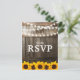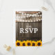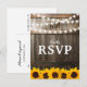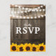 CARTÕES-POSTAIS DE CONFIRMAÇÃO DE CASAMENTO NO VINHEDO DE GIRASSÓIS | Fundo de barril de carvalho escuro de celeiro country, luzes de cordão cintilantes, girassóis amarelos dourados, seu monograma e um modelo de rsvp moderno. Encontre outros cartões de resposta de casamento de madeira em http://www.zazzle.com/special_stationery