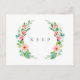 Coroa de ilha botânica em aquarela de folhagem verde e flores em tons bonitos de verde, coral, pêssego e rosa, cartão de confirmação de presença de casamento com pedido de música. Personalize o texto, customize o estilo da fonte, cor e tamanho.