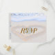 Um coração romântico na areia, cartões RSVP para casamentos de praia. Um dólar de areia repousa no meio do coração desenhado na areia. Casais podem personalizar muitos detalhes de escolhas de entrada para local de casamento. As noivas e os noivos podem usar este casamento atraente sozinho ou coordená-lo com selos postais e convites para cerimônias de casamento.