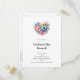 Birthday party invitation postcard with a beautiful illustration. A heart-shaped bouquet of flowers in pastel blue, green, purple and yellow. With a lovely blue butterfly hovering in front.