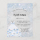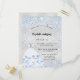 Para um doce elegante 16, 16 anos. Um fundo metálico falso prateado. Decorado com poeira azul esfolada e um vestido para uma festa de maravilha do inverno. Personalize e adicione um nome, idade e detalhes da festa. O nome é escrito com um script de estilo manuscrito