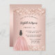 Um convite moderno, na moda e glamouroso para uma doce festa de aniversário 16, 16. Um fundo rosa de ouro com poeira falsa de ouro, uma garota vestindo um vestido de bola. O nome é escrito com um moderno estilo escrito à mão. Personalize e adicione os detalhes da sua festa.