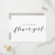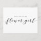 Peça ao membro mais jovem da sua comitiva de noiva para se juntar a você no seu grande dia com este Cartão Postal Elegante Renda Rústica Você Será Minha Menina de Flores. Este design apresenta um delicado padrão de renda floral branca sobre um fundo cinza suave. Perfeito para casamentos em celeiros rústicos, temas boho chic e comitivas de noiva inspiradas no vintage.