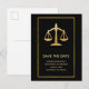 Cartão postal de graduação para salvar a data. Projetado com uma imagem de balanças douradas em um fundo preto. Uma moldura de folha dourada falsa cerca o design. Simples e elegante.