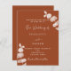 Fundo laranja escuro queimado, decorado com caules de eucalipto, galhos. Personalize e adicione seus nomes e detalhes. Fundo: fundo laranja escuro queimado. Adicione o URL do seu site de casamento ao código QR para que os seus convidados pesquisem mais detalhes/RSVP