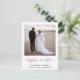 Anúncio de casamento elegante e sofisticado para fuga ou casamento menor, ou cartão postal de convite para recepção ou festa após o casamento. A frente apresenta sua fotografia, "felizes para sempre" escrito em uma fonte estilosa com floreios e seus primeiros nomes, data e local do casamento. No verso, você pode personalizar o anúncio do casamento com mais detalhes, adicionar um convite para recepção ou festa e assinar seus nomes de casados em uma fonte com estilo de assinatura.