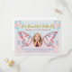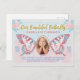 Estes convites de aniversário postais maravilhosamente únicos transformam seu filho em uma borboleta mágica! O design bonito tem um olhar de conto de fadas antigo em tons brancos de rosa, azul e ouro. A foto do seu filho preenche o centro das asas da borboleta. O design é feito em aquarela com detalhes falsos (impressos) de brilho e ornamentos florais. O texto da gliteria de ouro no topo diz, "Nossa Bela Borboleta", com espaço para o nome e a idade do seu filho. Abaixo disso, adicione todos os detalhes da festa.