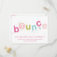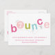 Este convite de aniversário de salto apresenta letras saltitantes em uma paleta colorida de girlie de rosa quente, rosas claro, verdes limões e aqua com idade editável em O. Uma super divertida e extras jogadas de girino em um trampolim, ginástica ou festa de salão. Este convite é inspirado por todas as meninas que gostam de saltar, saltar e voar. Clique em editar para personalizar.
