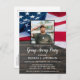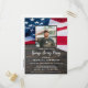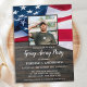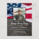 Convites de festa de despedida de soldado com bandeira americana. Estes convites de festa com bandeira americana são perfeitos para uma festa de despedida de soldado, despedida de implantação militar, celebração de boas-vindas em casa para militares, formatura militar e aposentadorias militares. Personalize este convite da bandeira americana com a foto do seu soldado, evento, nome e detalhes da festa.
