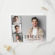 Convite de festa de formatura moderno minimalista com a foto do formando sobreposta a uma faixa de três fotos quadradas menores e "Graduado," o nome, a escola e o ano de formatura em tipografia simples. No verso, adicione os detalhes da festa.