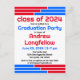Envie este Cartão-postal de Festa de formatura de Bares Vermelho e Azul à sua família e amigos. Personalize com seu nome de formando, ano de classe e detalhes da festa. Estes convites para cores vermelhas e azuis são uma na moda para mostrar o seu espírito escolar.