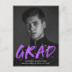 Convide convidados para comemorar os convidados com nossos convites para festa de formatura de fotos do Modern Paint Splatter. O design apresenta a foto vertical do formando com "Formando" em letras roxas com placas brancas de tinta. Personalize a frente dos convites para festas de formatura criativas adicionando o nome do formando, o nome da escola e o ano de graduação. A parte traseira do cartão postal de festa de formatura apresenta o endereço de devolução e os detalhes da festa. O design é perfeito para usar tanto para segundos graus como para formandos universitários.