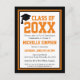 Este Cartão-postal de convite à Festa de formatura Negra e Laranja é uma forma excelente de celebrar o segundo grau ou formando universitário. Personalize isso com o nome, a escola, o ano e os detalhes da festa. Este convite apresenta uma tipografia ousada nas cores da escola em preto e laranja com uma borda em preto e laranja.