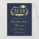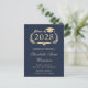 Convite de festa de formatura universitária azul escuro moderno com "Turma de" em uma ilustração dourada de uma coroa de louros com um topo de gorro de formatura e diploma e o nome do formando em uma letra dourada elegante. Adicione a escola, curso, honrarias ou planos futuros e os detalhes da festa de formatura.