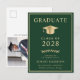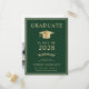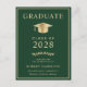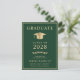 Convite de formatura universitária verde elegante e cartão postal de convite para festa com um chapéu de formatura dourado e tipografia moderna simples em dourado claro para o nome do formando, ano de formatura, universidade ou faculdade, grau e curso ou honrarias. No verso, adicione uma foto e os detalhes da festa de formatura.