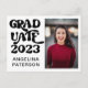 Vamos celebrar aquele graduado especial com este modelo ousado, único e moderno. As palavras graduado 2023 estão em uma tipografia retrô superdimensionada em preto sobre um fundo branco. A foto aparece na frente e todos os detalhes da sua festa estão elegantemente colocados no verso com "Vamos Celebrar o Graduado" em grande letra cursiva retrô. Personalize este design com suas informações exclusivas para criar um convite de festa impressionante.
