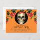 Crânio gótico e apavorante Convite postal do partido Haloowen para a sua festa de Halloween. Um crânio estranho com flores em laranja e preto com uma fonte distorcida e peculiar.