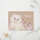 Adoravelmente, o gatinho branco persa está ligeiramente enredado em fitas pastéis e anunciando uma festa! com texto facilmente alterado ou removido, amantes de gatos postais