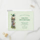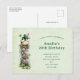 Birthday invitation postcard with a cute St. Patrick's Day image. A green frog with big cartoon eyes sitting on a stone wall. Wearing a green top hat with a shamrock and a little friend sitting on top of his hat.