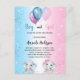Para um chá de fraldas para um bebê e uma menina. Um plano de fundo azul branco e rosa. Decorados com balões claros e azuis, cor-de-rosa e branco e poeira brilhante. Um elefante bebê e um elefante da gaby. Personalize e adicione o nome da futura mãe e os detalhes da festa. O nome e o texto: Boy ou Girl são escritos com um estilo escrito à mão