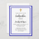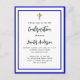 Um convite moderno, elegante e de confirmação. Um fundo branco decorado com quadros azuis reais e uma cruz ouro. Personalize e adicione um nome e detalhes. Letras pretas coloridas.