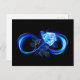 Luminous infinity symbol with glowing, beautiful, lushly blooming rose made of blue flames on black background.