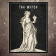 misterioso cartão de visita com moldura em água-forte de bruxa segurando uma tocha.