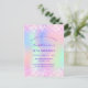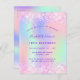 Um convite de aniversário feminino do 18º (ou qualquer idade). Na frente: Um arco-íris, fundo holográfico colorido em roxo, rosa, verde-menta. Decorado com confete cor-de-rosa penteado. Personalize e adicione um nome e detalhes da parte. O nome é escrito com um script de estilo manuscrito, letras cor roxa.