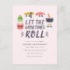 Que os bons tempos se desenrolem! Convite de festas de aniversário bonito com rolinhos de kawaii sushi contra fundo rosa pastel.