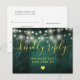 Um cartão de RSVP de celeiro rústico em madeira com luzes de corda verde esmeralda e tipografia dourada chique. O verso apresenta seus detalhes e um divertido pedido de música para o convidado. Criado por Thisisnotme©
