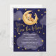 O convite para o chá do bebê "Over the Moon Teddy Bear Twinkle Little Stars" cria maravilhosamente sonhos com um toque de serenidade celestial. Apresenta uma representação aquarela de um ursinho de pelúcia em madeira numa lua crescente, rodeada por uma ligeira constelação de estrelas, capturando a essência de uma infância pacífica. O design é posicionado contra um pano de fundo azul marinho, aprimorado com uma textura de cor d'água abstrato e nuvens moles, oferecendo uma vibração tranquila e acolhedora para o seu anúncio. Perfeito para celebrar a chegada de um menino, este convite é para encantar seus convidados e estabelecer um humor mágico para o chá de fraldas.