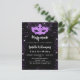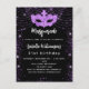 Para uma Mascarada elegante, 21ruas (ou qualquer idade) festa de aniversário. Um clássico fundo negro. Decorado com faxes roxos e uma máscara de mascarada. Personalize e adicione um nome, idade e detalhes da festa. O nome é escrito com um script de estilo manuscrito