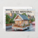 Casa branca e divertida em rodas NÓS MOVEMOS cartão postal com novo endereço e aviso de casa aberta.