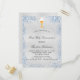 Fundo de aspecto fino prateado decorado com poeira azul esmaecida poeira falsa, um cálice de ouro e um hospedeiro. Personalize e adicione um nome e detalhes de recepção. Letras pretas coloridas.