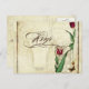 NOTA: esses RSVPs de cartão-postal são um pouco grandes demais para ajustado nos envelopes de convite quadrado sem aparar. Recomenda-se a utilização com o tamanho de 5 x 7 ou superior. SELEÇÃO DE PAPEL: Os cartões postais são impressos em um cartão pesado muito bonito, brilhante no lado frontal e foscado no reverso. COLOR PALETTE: bronzeado, pergaminho, marrom, laranja e vermelho. DESIGN COLLECTION: Criado a ajustado de um tema de casamento elegante, bonito, no estilo de celeiro do país rústico, este é um conjunto completo de convites para o casamento. Esta feminina, floral, moderna, estilo de vintagem, que testava a publicidade aos perfumes franceses numa mão pintada com pergaminho de fundo, foi antiquada, amontoada e texturizada durante o processo de design. Ilustrações antigas de bolbos de flores botânicas de várias Tulipas em vermelho, borboleta laranja e entalhes decorativos de rolo de ornamento da impressora adicionam um toque de florescência. Um quadro de etiqueta de estilo colchete contém outra tulipa, com um par de asas do Angel e girando designs gravadas como um padrão no fundo.