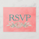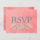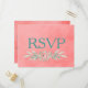 Envie cartões-resposta encantadores usando este adorável fundo de pergaminho rosa com RSVP. A frente do cartão postal tem um belo texto azul com "RSVP" escrito em negrito. Uma flor rosa e verde está por baixo. O verso também apresenta um fundo de pergaminho rosa com texto para inserir informações sobre nome, data e local. Compre o seu hoje!