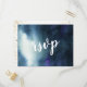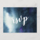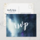 Cartão RSVP Elegante para o seu casamento com o marinho azul e o ouro! Este cartão-postal tem uma bela cor d'água pintada de fundo em cor azul marinho. Diz "rsvp" na letra moderna do script. No verso, há brilhos dourados em ambos os lados do cartão, e os convidados podem escrever seu nome e número de participantes. Seu endereço também pode ser pré-impresso. Os textos são facilmente personalizáveis on-line.