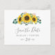 Esta horizontal de girassol rústico salvo o cartão postal é perfeito para um casamento country. O design floral boêmico apresenta girassóis amarelos, flores cor-de-rosa pinceladas e verde-caçador de eucalipto verde em aquarela com um elegante e moderno sentimento de bolho.
