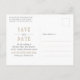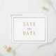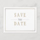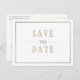 Salve a Data Cartão postal de casamento minimalista em branco dourado. Simples e elegante. Branco com texto em dourado antigo. Design versátil excelente para casamentos, noivados, aniversário de casamento e outras ocasiões especiais. Personalize com seu próprio texto e você também pode excluir ou substituir qualquer elemento com as ferramentas fornecidas no menu de personalização da Zazzle.