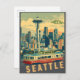 Uma ilustração de cartão postal, no estilo vintage, que evoca o charme e o caráter de Seattle, Washington.