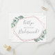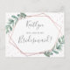 Este cartão postal de convite super bonito é a maneira perfeita de perguntar "será minha dama de honra?" O design apresenta uma estrutura geométrica de folha de rosa de ouro cônica com texto tipográfico de tendências e cor d'água exuberante eucalipto verde. Estes cartões postais são fáceis de personalizar e podem ser usados para pedir aos seus entes queridos que sejam a sua dama de honra, empregada ou dama de honra, florista, etc.